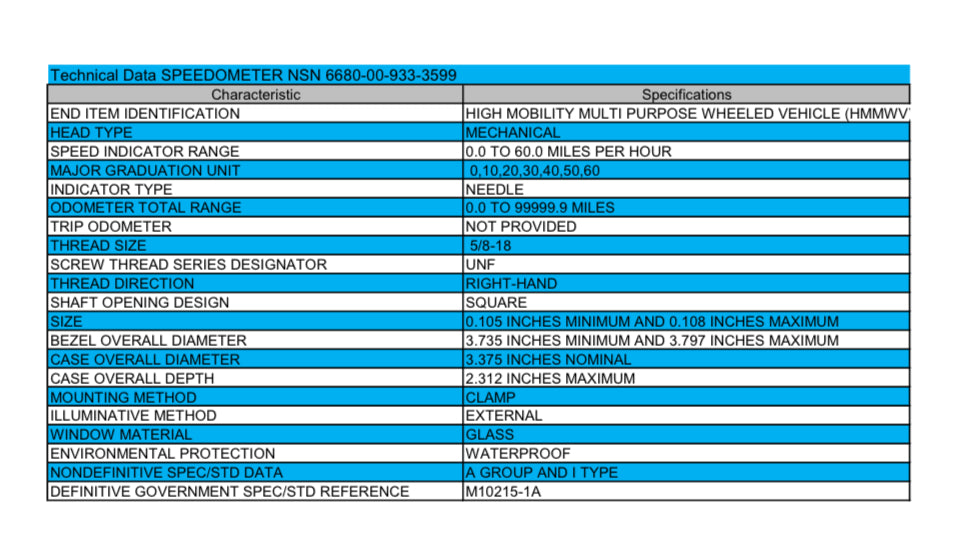* Military Humvee speedometers are mechanical, using a cable to transmit speed information from the vehicle's drivetrain to the speedometer in the dashboard. This is a more robust and reliable system compared to electronic speedometers, as it's less prone to damage and easier to repair in the field.
